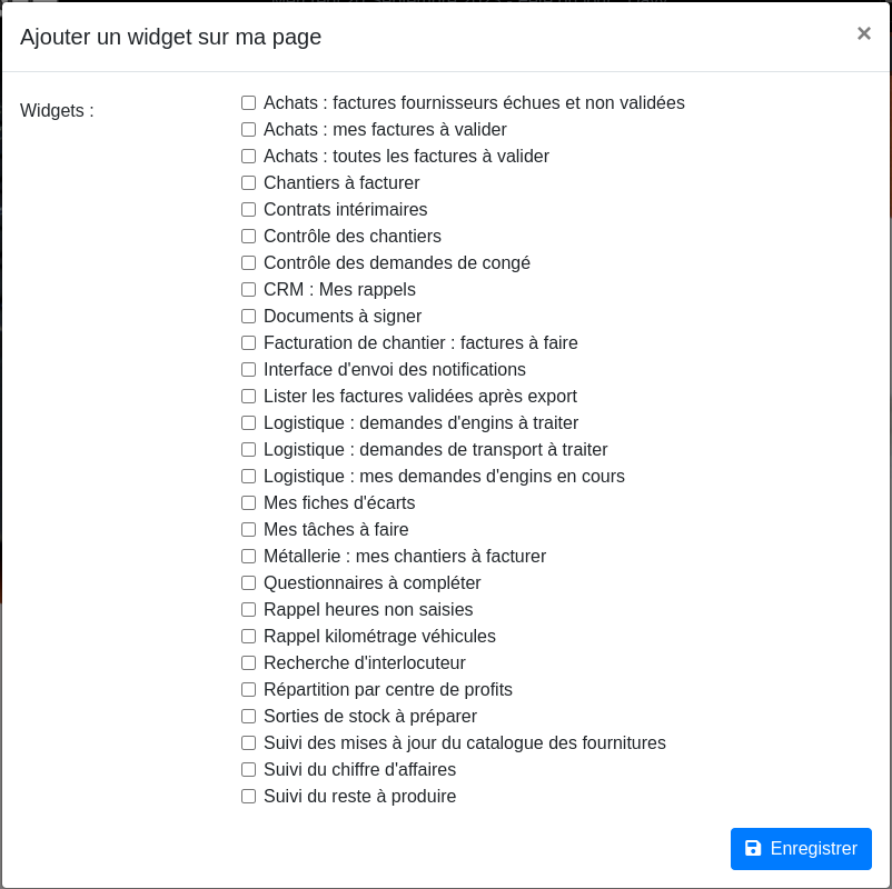 La liste des widgets disponibles peut varier en fonction de vos droits utilisateurs.