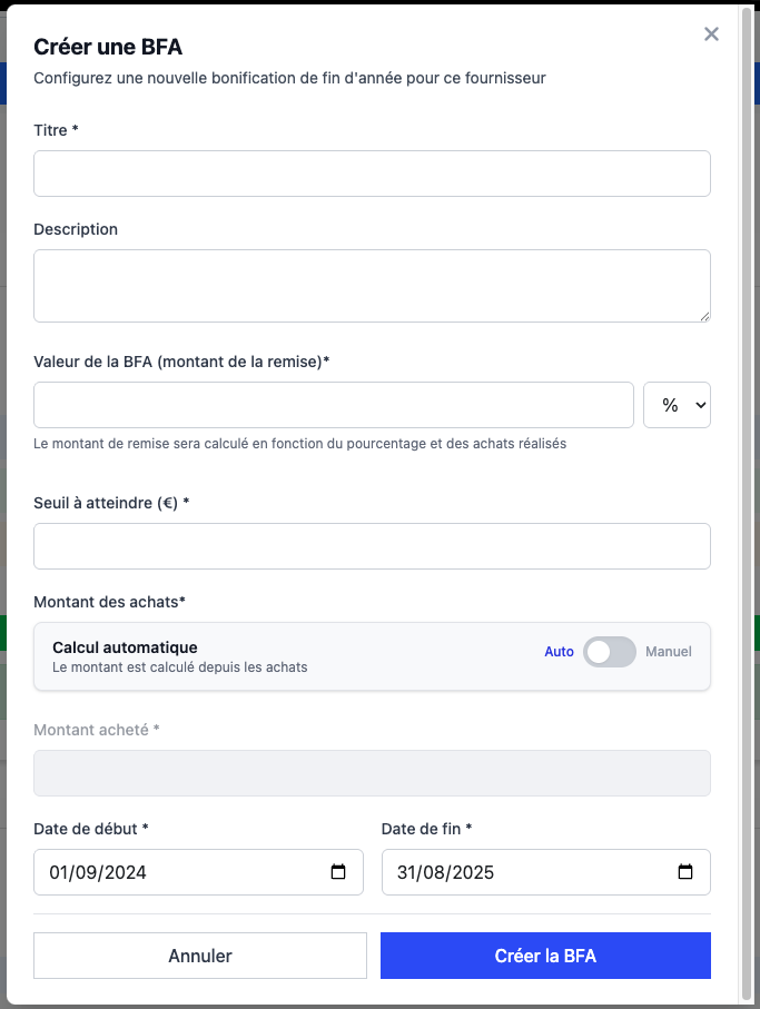 La section BFA permet de gĂ©rer les bonus de fin dâannĂ©e accordĂ©s par le fournisseur.