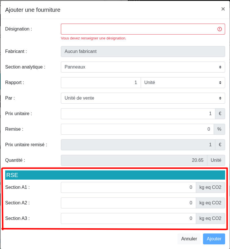 Les taux RSE associĂ©s Ă une fourniture peuvent ĂȘtre ajustĂ©s directement depuis le formulaire de modification de la fourniture.
