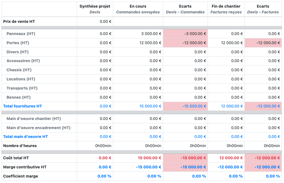 Lâonglet SynthĂšse dĂ©taillĂ©e permet dâanalyser les montants dĂ©taillĂ©s pour lâensemble des chantiers du projet.