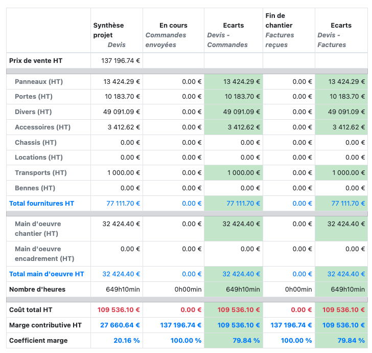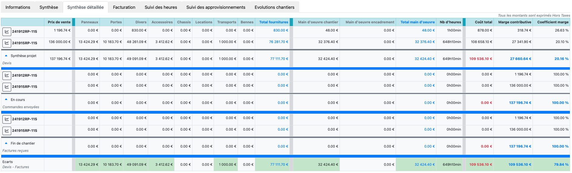 Lâonglet SynthĂšse dĂ©taillĂ©e permet dâanalyser les montants dĂ©taillĂ©s pour lâensemble des chantiers du projet.