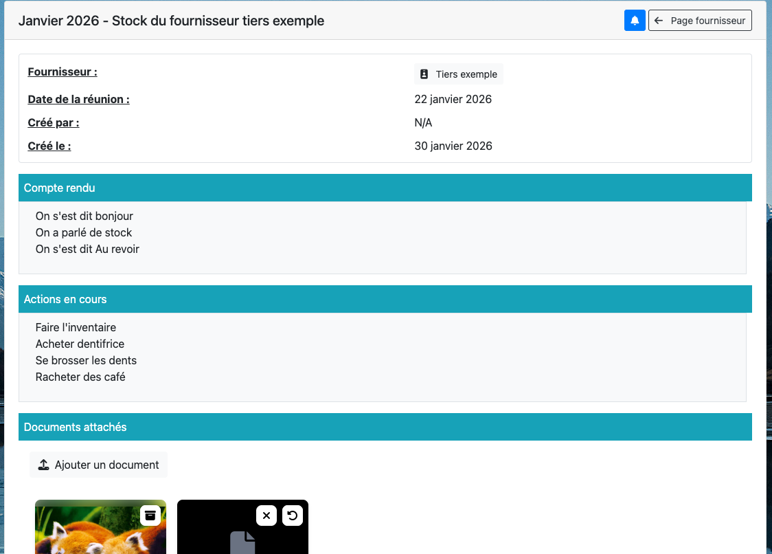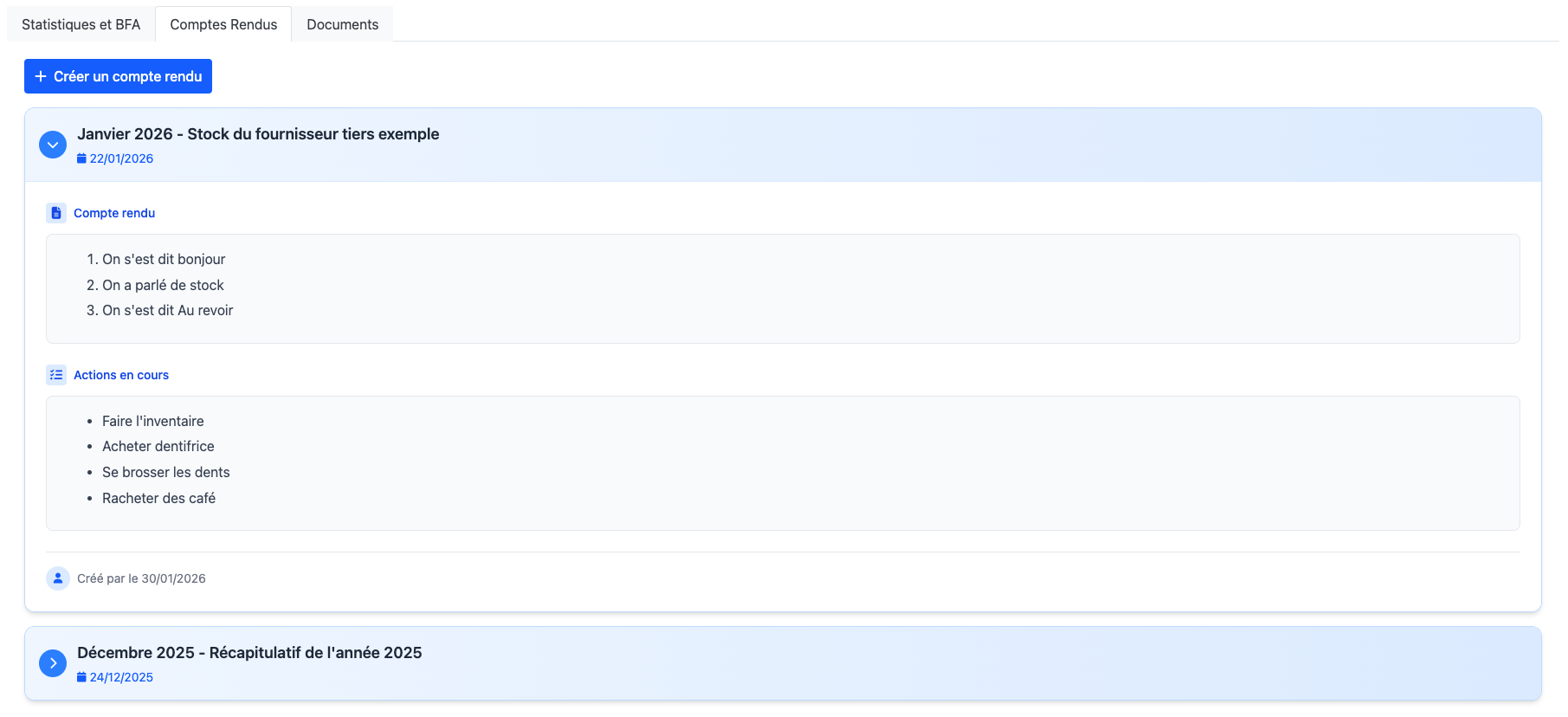 Lâonglet Comptes rendus affiche lâensemble des comptes rendus liĂ©s au fournisseur :