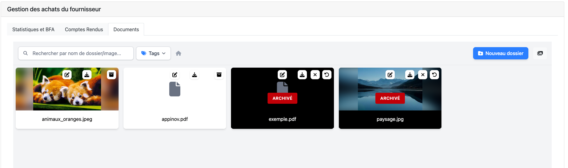 Lâonglet Documents affiche lâensemble des documents liĂ©s aux comptes rendus fournisseurs, dans une vue dĂ©diĂ©e.