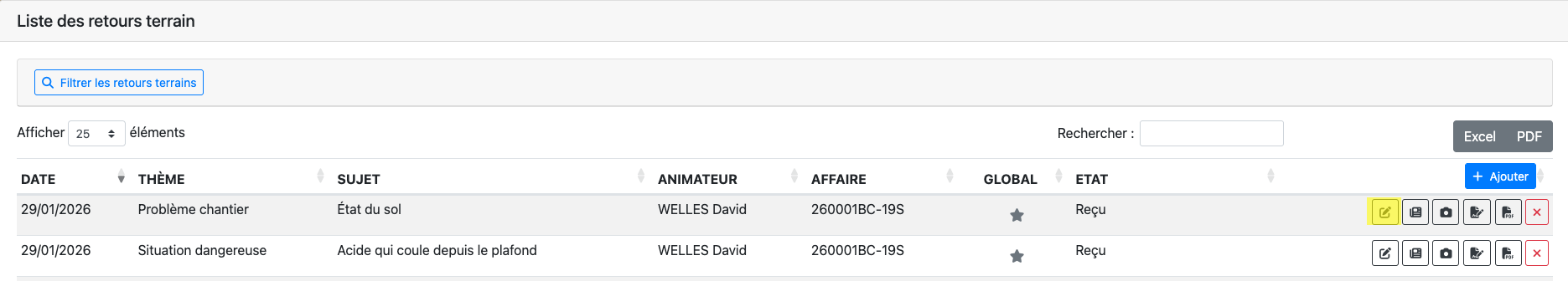 Les retours terrain sont classés selon trois états, reflétant leur avancement :