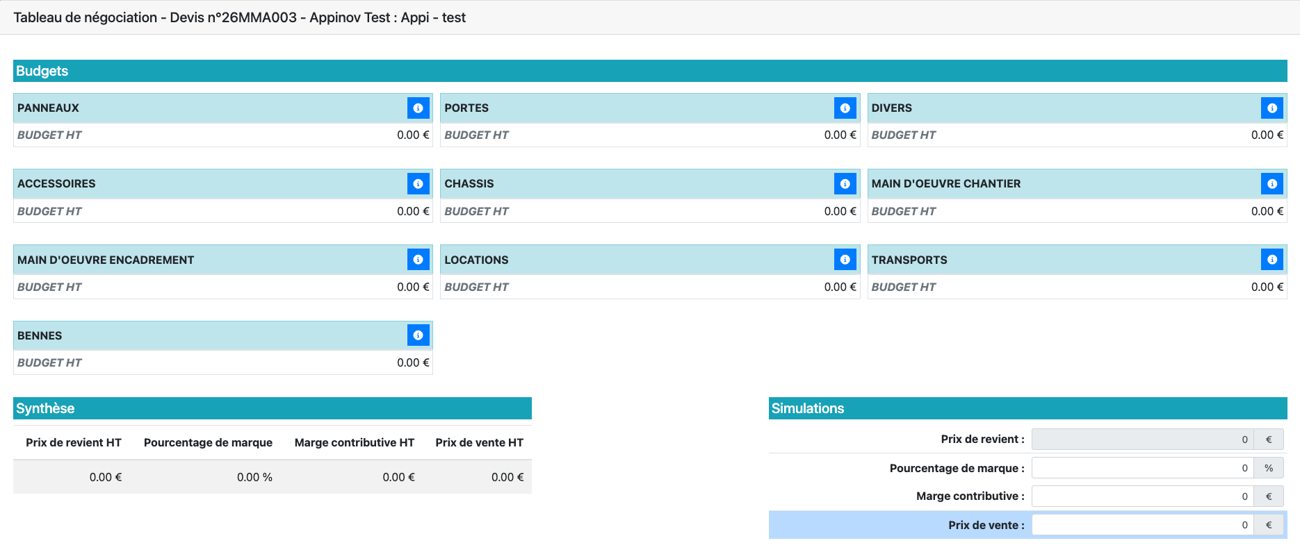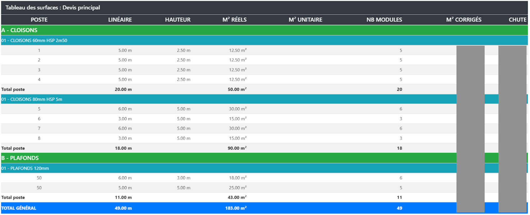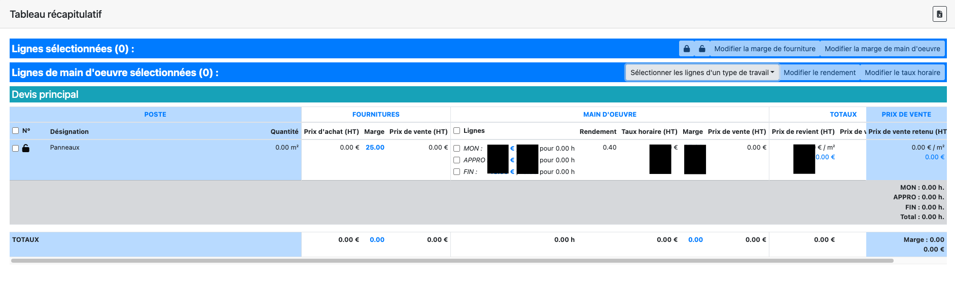 Ouvre un tableau détaillé de tous les postes du devis. Vous pouvez y modifier :