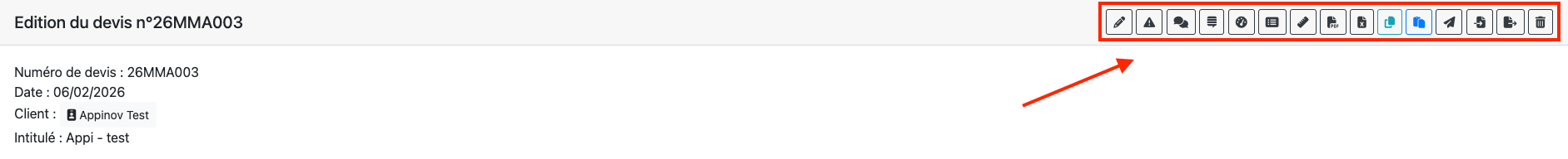 Une fois le devis ouvert, les boutons dâaction sont situĂ©s en haut Ă droite.