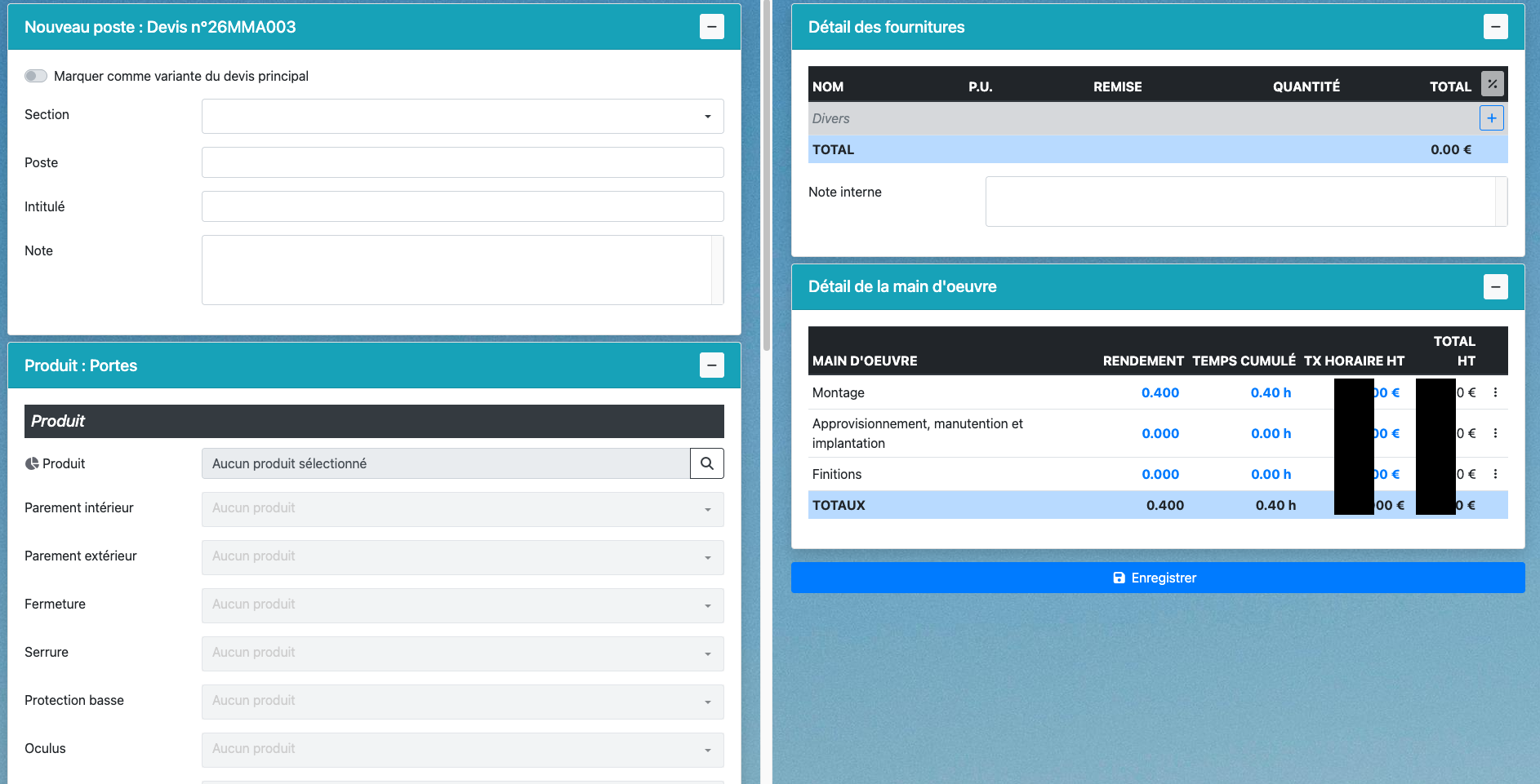 Chiffrer une porte : choix produit, options, et ajout de compléments non référencés.
