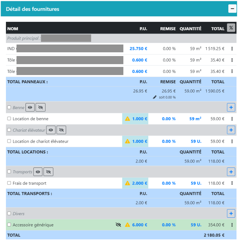Détail des fournitures