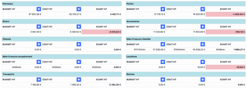 Les sections présentant un dépassement de budget apparaissent en 🔴 rouge.