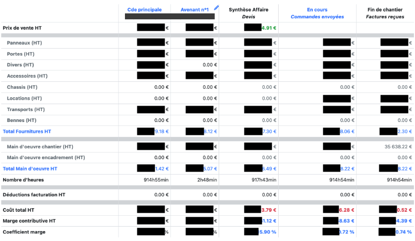 Elle permet de comparer, à tout moment, le prévisionnel issu du devis avec le réalisé provenant des commandes fournisseurs, des heures de chantier et des factures.