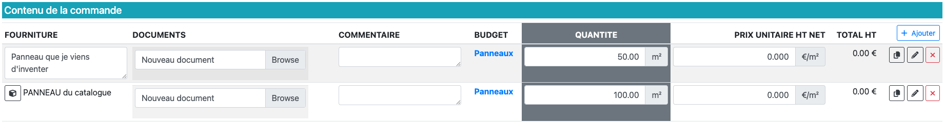 La quantité : On peut la modifier en la changeant ici directementL'unité : Modifiable avec le bouton de modification si la fourniture ne provient pas du catalogue