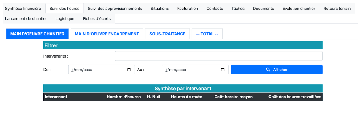 Le détail des heures réalisées sur une affaire est accessible depuis l’onglet Suivi des heures du suivi de chantier.