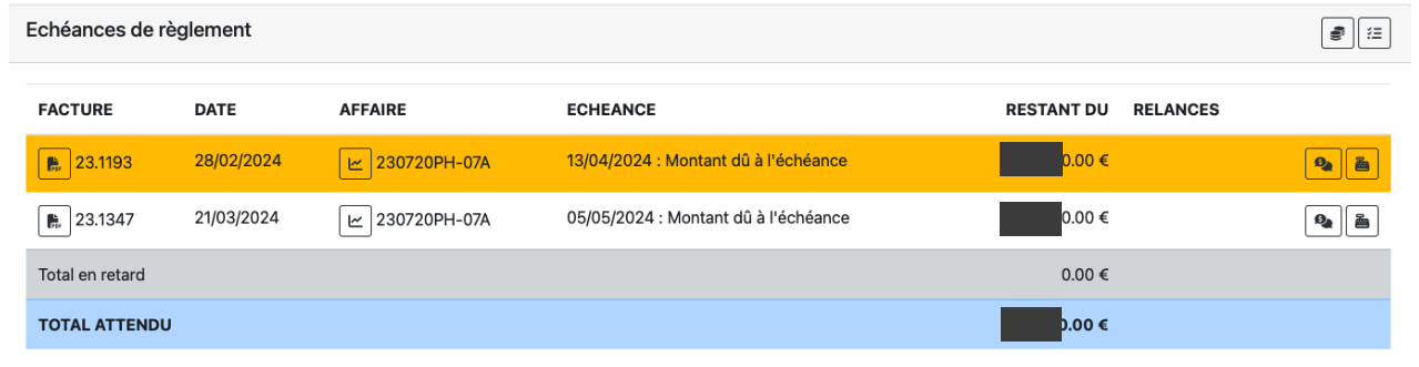 Les factures dont l’échéance est dépassée apparaissent en jaune afin d’alerter visuellement sur les retards de paiement.
