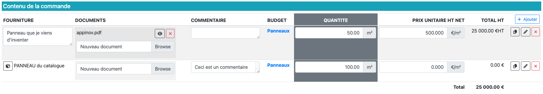 Chaque ligne correspond à une fourniture ou un élément ajouté, avec plusieurs sections et boutons d’actions détaillés ci-dessous.