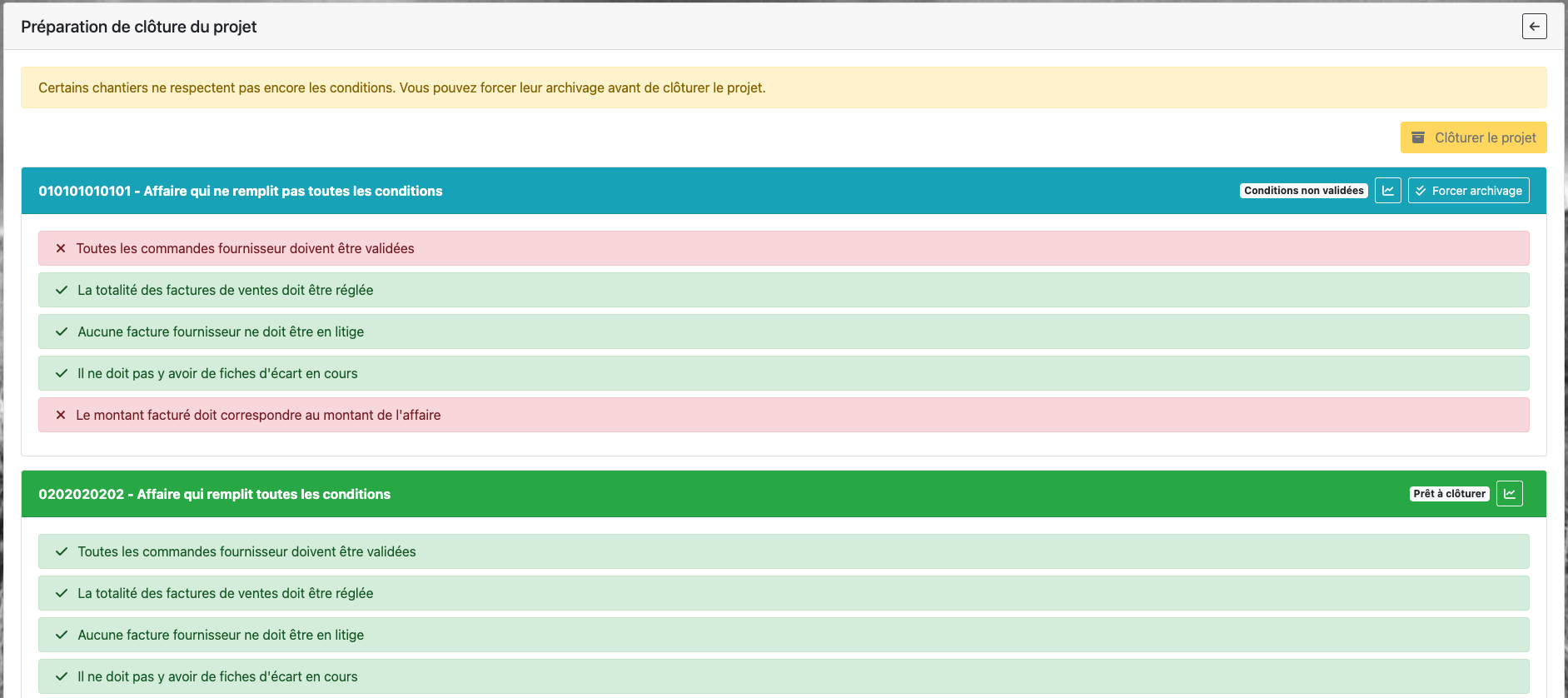 La clĂŽture dâun projet permet dâarchiver lâensemble des chantiers qui le composent et de figer dĂ©finitivement sa situation.