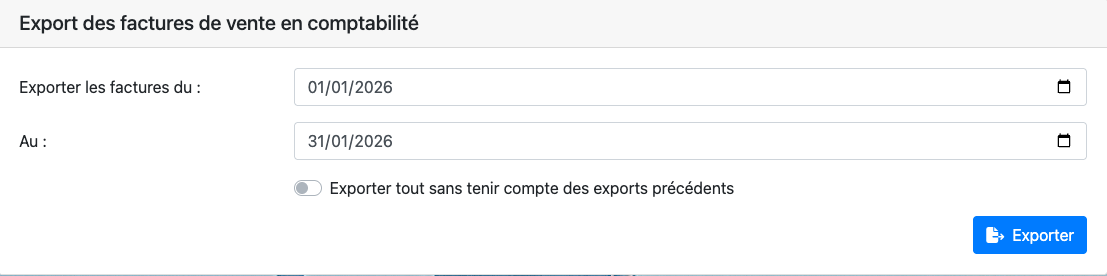 Une fonction d’export des factures clients en comptabilité est disponible en option, après étude et définition du format attendu par votre service comptable.