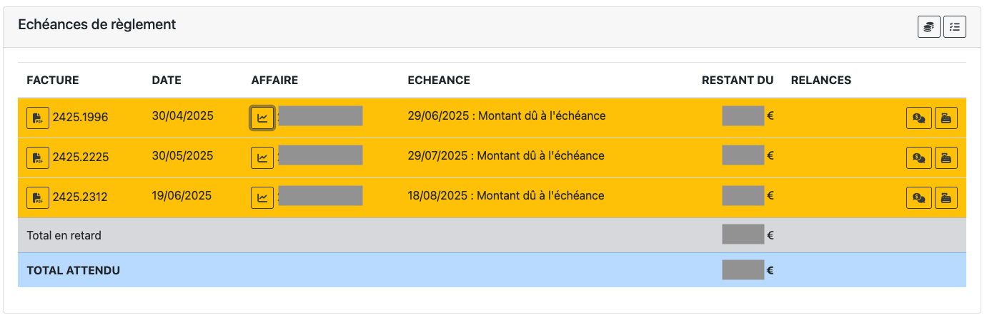 Les échéances de factures non soldées sont également visibles directement sur la fiche du client (tiers).