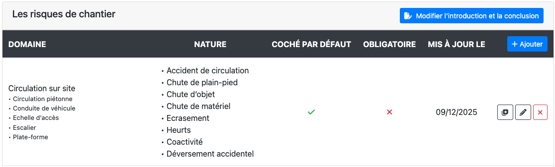 Cette section vous permet de définir les différents risques de chantier à prendre en compte.