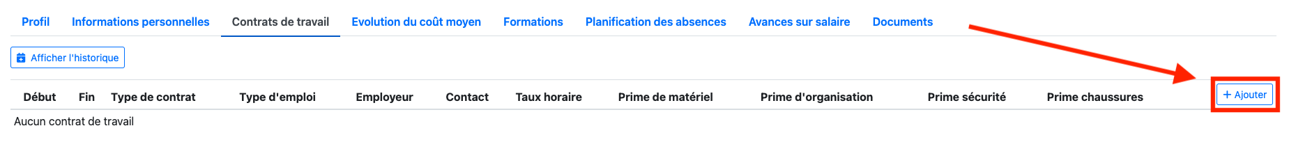 Depuis l’onglet Contrats de travail, vous pouvez consulter le contrat actif et l’historique.