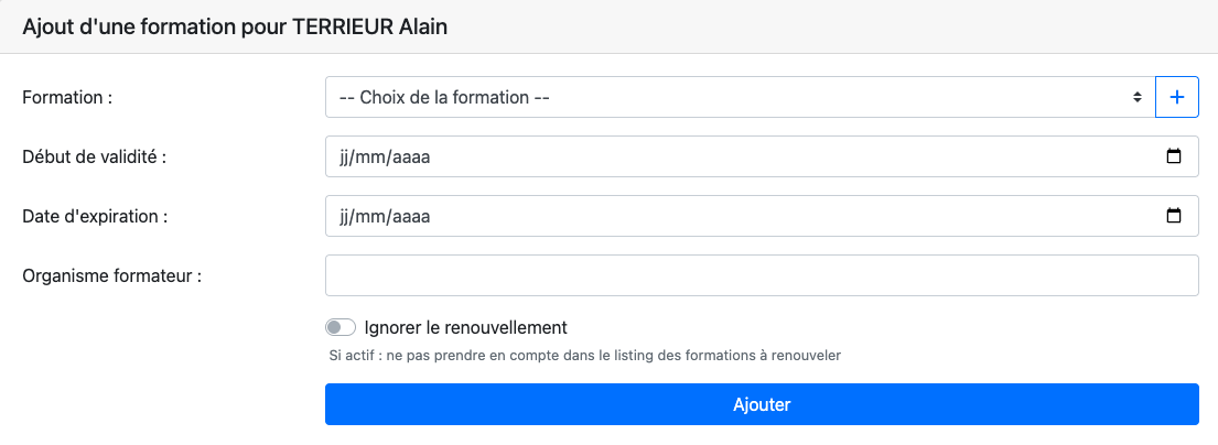 Un widget Formations à renouveler permet de suivre les échéances proches.
