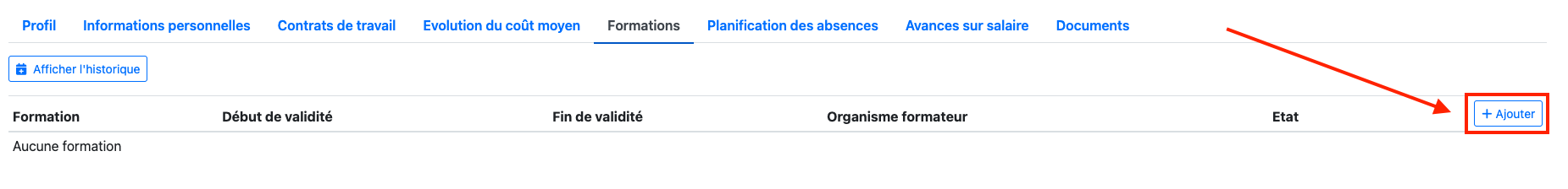 Les formations sont saisies depuis l’onglet Formations de la fiche salarié.