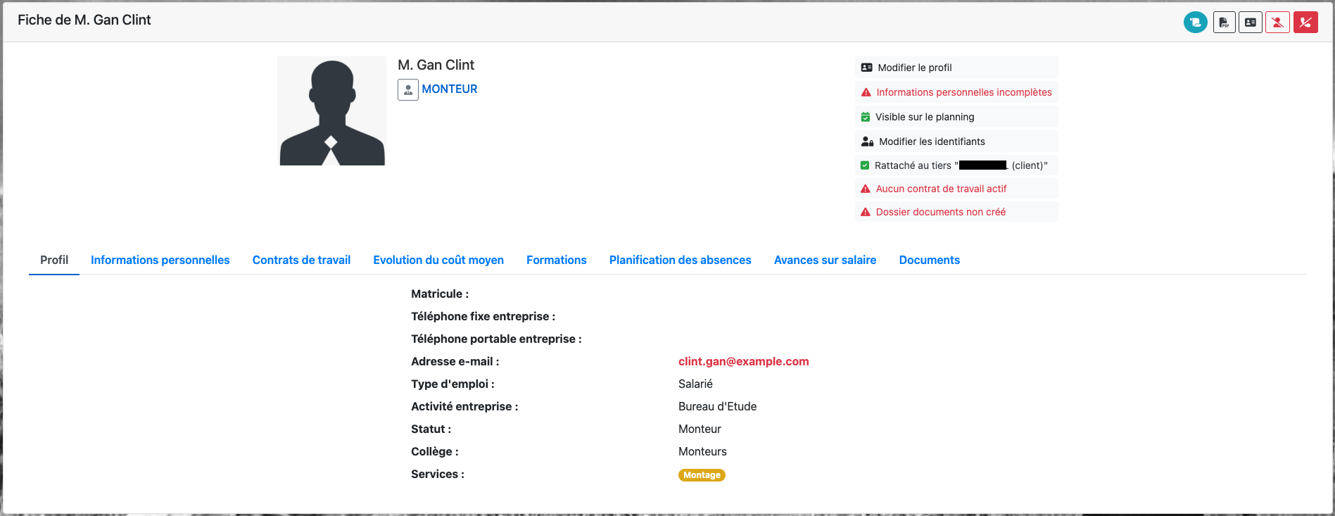- La partie haute qui contient des actions et des informations concernant le salarié