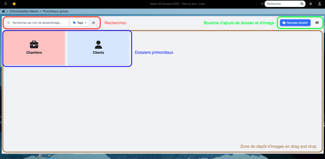 La photothèque permet de centraliser, organiser et retrouver l’ensemble des photos et dossiers liés aux chantiers, clients et autres éléments de l’application.
